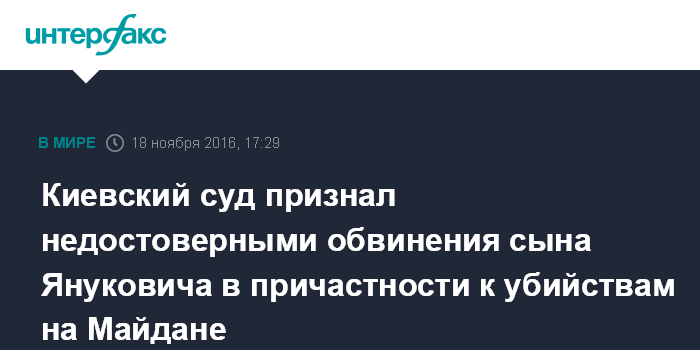 Москва. 18 ноября. INTERFAX.RU - Печерский районный суд Киева признал недостоверной информацию о причастности сына бывшего президента Украины Виктора Януковича Александра к убийствам на Майдане, распространенную народным депутатом Украины, советником министра внутренних дел Антоном Геращенко.