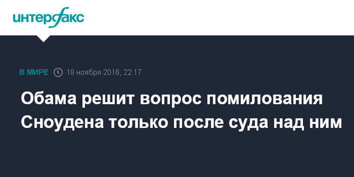 Москва. 18 ноября. INTERFAX.RU - Президент США Барак Обама заявил, что не может рассматривать возможность помилования экс-сотрудника АНБ Эдварда Сноудена до тех пор, пока тот не предстанет перед американским судом.