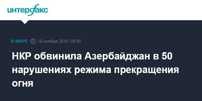 Москва. 19 ноября. INTERFAX.RU - В ночь на 19 ноября на карабахско-азербайджанской линии соприкосновения Вооруженные силы Азербайджана нарушила режим прекращения огня 55 раз, сообщили "Интерфаксу" в субботу утром в пресс-службе министерства обороны непризнанной Нагорно-Карабахской республики (НКР).