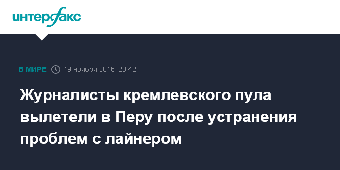 Москва. 19 ноября. INTERFAX.RU - Журналисты кремлевского пула, которые задержались в Лиссабоне из-за поломки самолета, вылетели в Лиму для освещения саммита АТЭС в Перу.