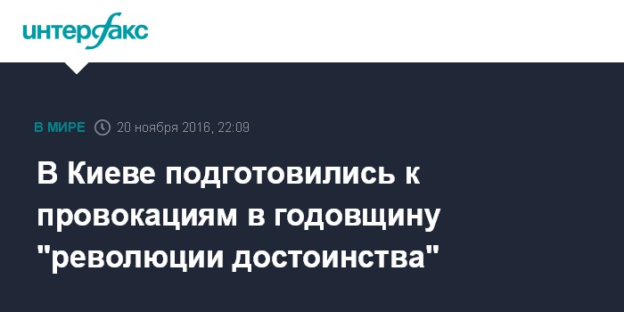 Москва. 20 ноября. INTERFAX.RU - В МВД Украины сообщили о повышенном уровне террористической угрозы в Киеве в период празднования третьей годовщины "революции достоинства", которое состоится 21-22 ноября. Об этом в воскресенье сообщил советник главы МВД Зорян Шкиряк. Он также заявил, что министерство готовится к провокациям со стороны российских спецслужб и внутренних "деструктивных сил".
