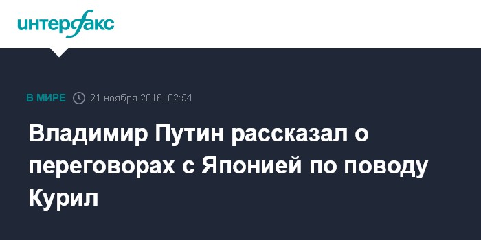 Москва. 21 ноября. INTERFAX.RU - Владимир Путин заявил, что отсутствие мирного договора между Россией и Японией - это пережиток прошлого, являющийся тормозом для развития двусторонних отношений.