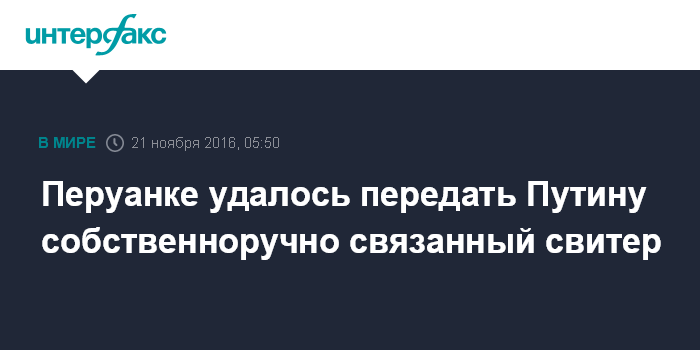 Москва. 21 ноября. INTERFAX.RU - Владимиру Путину все же достался свитер из альпаки, который к его приезду к Лиму связала местная жительница Хулия Кастро. Накануне она хотела вручить подарок лично, но к российскому президенту женщину не пустила служба безопасности, и в итоге она оказалась в полицейском участке.