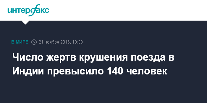 Москва. 21 ноября. INTERFAX.RU - До 142 человек возросло число погибших в результате крушения поезда в штате Уттар-Прадеш на севере Индии, сообщают в понедельник западные СМИ.