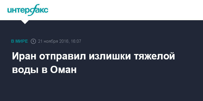 Москва. 21 ноября. INTERFAX.RU - Иран вывез излишки тяжелой воды в Оман после замечания со стороны МАГАТЭ, сообщает в понедельник агентство ИРНА.