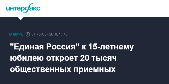 Москва. 21 ноября. INTERFAX.RU - "Единая Россия" к своему 15-летнему юбилею дополнительно откроет 20 тысяч общественных приемных, сообщила пресс-служба партии.