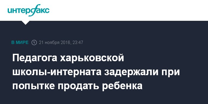 Москва. 21 ноября. INTERFAX.RU - Сотрудники уголовного розыска, прокуратуры и следственного управления Главного управления Национальной полиции в Харьковской области задержали педагога школы-интерната, которая намеревалась продать 13-летнюю воспитанницу за $10 тыс. Педагог задержана, решается вопрос об избрании ей меры пресечения. Ведутся первоочередные следственные действия.
