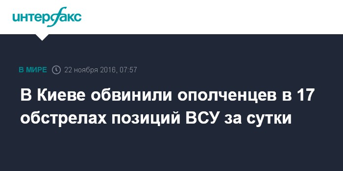Москва. 22 ноября. INTERFAX.RU - Ополченцы в Донбассе за прошедшие сутки 17 раз обстреливали позиции военнослужащих Вооруженных сил Украины, сообщает во вторник пресс-служба штаба силовой операции в фейсбуке. По данным пресс-службы, на Мариупольском направлении по Широкиному, Гнутовому и Славному ополченцы стреляли из минометов разных калибров, а из гранатометов и вооружения БТР - по Марьинке и Лебединскому.