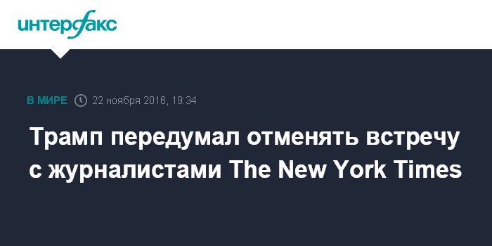 Москва. 22 ноября. INTERFAX.RU - Избранный президент США Дональд Трамп, отменивший во вторник утром встречу с журналистами издания The New York Times, в итоге принял решение встретиться с ними, сообщается на странице политика в твиттере.
