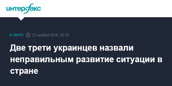 Москва. 22 ноября. INTERFAX.RU - Только 17,4% украинцев считают, что ситуация в стране развивается в правильном направлении, однако большинство уверено, что в краткосрочной или среднесрочной перспективе государство преодолеет существующие трудности, свидетельствуют данные социсследования Центра Разумкова.