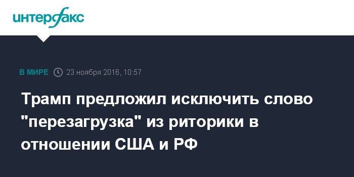 Москва. 23 ноября. INTERFAX.RU - Избранный президент США Дональд Трамп подтвердил, что хотел бы добиться более теплых отношений с РФ, но при этом отметил, что не считает правильным использовать термин "перезагрузка", сообщают в среду американские СМИ.