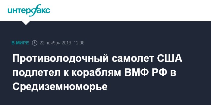 Москва. 23 ноября. INTERFAX.RU - Патрульный противолодочный самолет ВМС США Р-8А Poseidon в среду совершил разведывательный подлет к району дислокации корабельной авианосной группы ВМФ России, в которую входит тяжелый авианесущий крейсер "Адмирал Кузнецов", в Восточном Средиземноморье, свидетельствуют данные западных сайтов, отслеживающих передвижения военной авиации.
