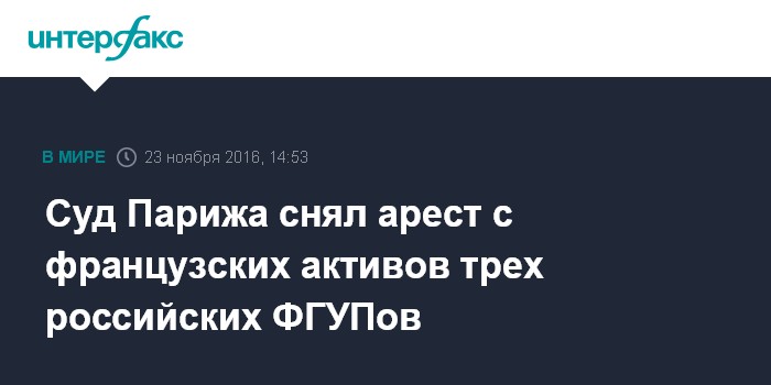 "Сегодня, 23 ноября, Апелляционный суд Парижа вынес три решения о снятии арестов с французских активов федеральных государственных унитарных предприятий (ФГУП) "Космическая связь", "Госзагрансобственность" и РАМИ "РИА Новости", включая дебиторскую задолженность", - сказал Кондаков в среду "Интерфаксу".