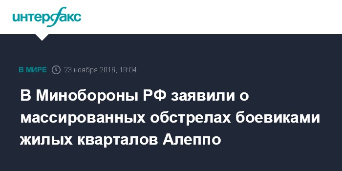 Москва. 23 ноября. INTERFAX.RU - Боевики ведут массированные обстрелы жилых кварталов сирийского Алеппо, в результате которых гибнут десятки людей, в том числе дети, заявил в среду официальный представитель Минобороны РФ генерал-майор Игорь Конашенков.