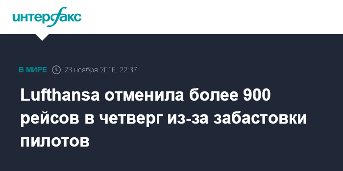 Москва. 23 ноября. INTERFAX.RU - Руководство германской авиакомпании Lufthansa было вынуждено отменить 912 авиарейсов из примерно 3 тыс., запланированных на этот четверг, в связи с забастовкой пилотов, сообщает в среду агентство Associated Press.