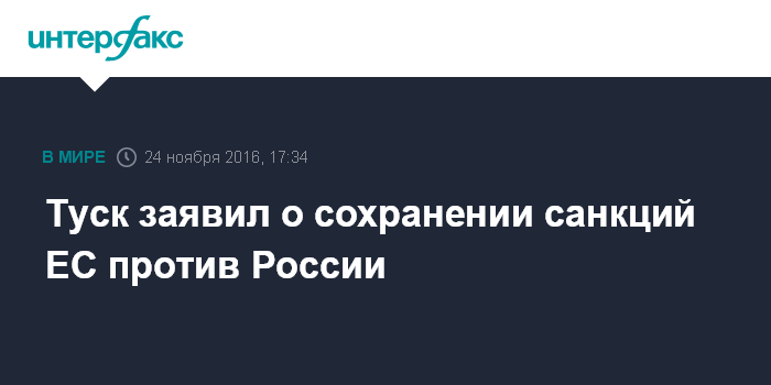 Москва. 24 ноября. INTERFAX.RU - Евросоюз будет продлевать санкции против России до полного выполнения минских соглашений по Восточной Украине, заявил председатель Европейского совета Дональд Туск.