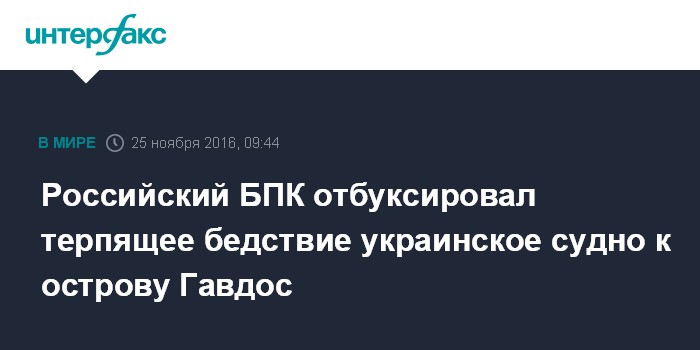 Москва. 25 ноября. INTERFAX.RU - Корабль ВМФ России в Средиземном море отбуксировал терпящее бедствие украинское судно на стоянку греческого острова Гавдос , сообщили "Интерфаксу" в пятницу в министерстве обороны России.