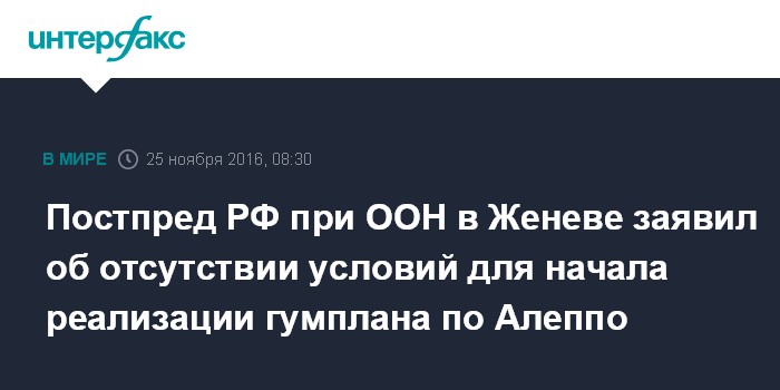 Москва. 25 ноября. INTERFAX.RU - Россия готова способствовать гуманитарным поставкам ООН в Восточный Алеппо, но для их начала необходимы твердые официальные гарантии со стороны находящихся там незаконных вооруженных формирований (НВФ), заявил постпред РФ при ООН и других международных организациях в Женеве Алексей Бородавкин.