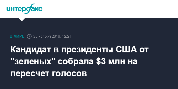 Москва. 25 ноября. INTERFAX.RU - Кандидат в президенты США от партии "зеленых" Джилл Стайн собрала более $3 млн для проведения пересчета голосов в ряде штатов, сообщила в пятницу газета Politico.