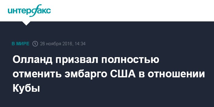 Москва. 26 ноября. INTERFAX.RU - Президент Франции Франсуа Олланд в субботу призвал к полной отмене американского эмбарго против Кубы, сообщают французские СМИ.