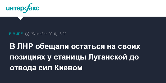 Москва. 26 ноября. INTERFAX.RU - Подразделения Народной милиции самопровозглашенной Луганской народной республики останутся на прежних позициях в районе станицы Луганской до тех пор, пока украинская сторона не начнет отводить подразделения с сопредельной стороны, заявляют в ЛНР.