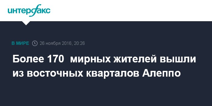 Москва. 26 ноября. INTERFAX.RU - 171 мирный житель покинул подконтрольные экстремистам восточные кварталы сирийского города Алеппо и перешла в удерживаемые правительственными войсками районы, сообщили в субботу официальные сирийские СМИ.