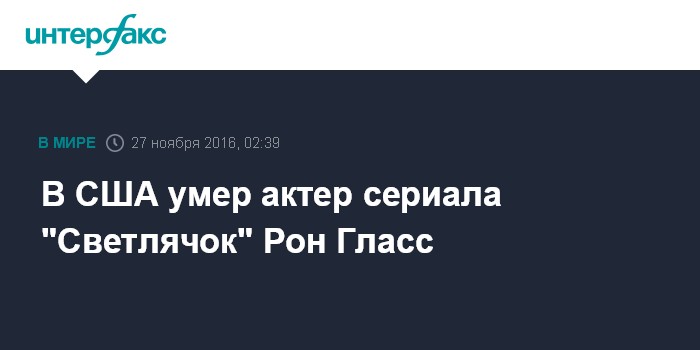 Москва. 27 ноября. INTERFAX.RU - В Лос-Анджелесе на 72 году жизни умер актер Рон Гласс, известный по своим ролям в сериалах "Светлячок" и "Миссия "Серенити"", сообщает в субботу The Hollywood Reporter.