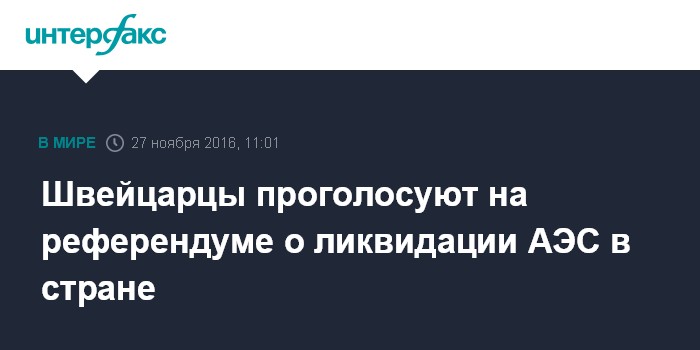 Москва. 27 ноября. INTERFAX.RU - В Швейцарии в воскресенье проходит референдум по вопросу, не стоит ли ускорить процесс ликвидации АЭС в стране, сообщает "Би-би-си".