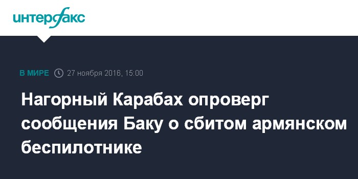 Москва. 27 ноября. INTERFAX.RU - Министерство обороны непризнанной Нагорно-Карабахской республики (НКР) опровергло сообщение о том, что азербайджанские военные уничтожили армянский беспилотный летательный аппарат.