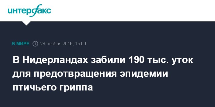Москва. 28 ноября. INTERFAX.RU - В Нидерландах были забиты не менее 190 тыс. уток для предотвращения распространения птичьего гриппа на соседние европейские страны.