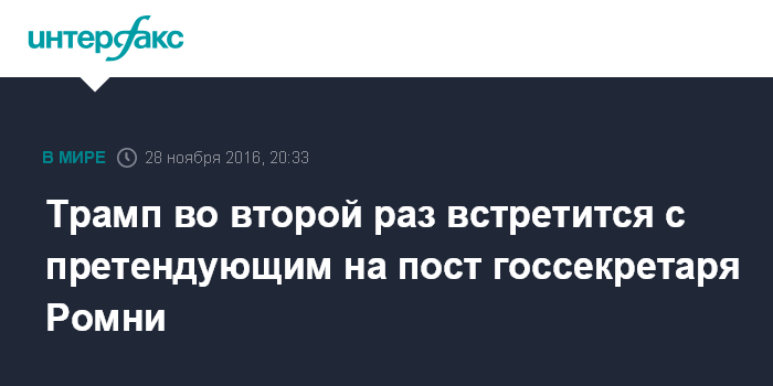 Как заявил в понедельник журналистам представитель переходной команды Шон Спайсер, встреча пройдет во вторник в Трамп-тауэр в Нью-Йорке. В свою очередь пресс-секретарь переходной команды Джейсон Миллер не стал отвечать на вопрос о том, означает ли уже вторая по счету встреча Трампа и Ромни, что избранный президент определился с кандидатурой главы внешнеполитического ведомства.