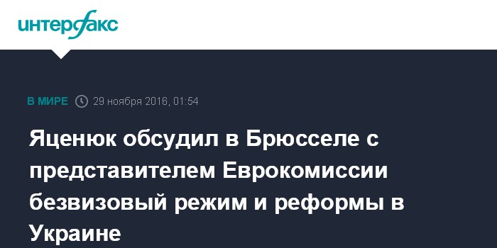 Москва. 28 ноября. INTERFAX.RU - Экс-премьер-министр Украины Арсений Яценюк в Брюсселе обсудил с членом Еврокомиссии по вопросам европейской политики соседства и расширения Йоханнесом Ханом вопросы предоставления Украине безвизового режима и практической поддержки украинских реформ, сообщила пресс-служба партии "Народный фронт".