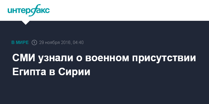 Москва. 29 ноября. INTERFAX.RU - Египетские военные присутствуют на сирийской территории и принимают участие в борьбе с террористическими организациями, пишет газета "Известия" во вторник, ссылаясь на источник в российских военно-дипломатических кругах.