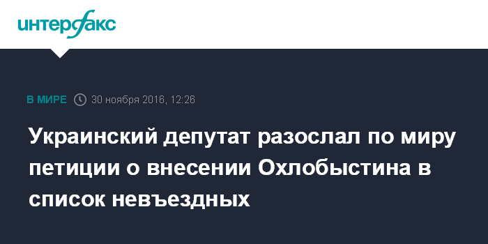 "Отправляю сегодня обращение послам 28 стран ЕС, США, Канады, Австралии, Японии, Израиля с требованием внести Ивана Охлобыстина в список лиц, которым запрещен въезд в страны цивилизованного мира" , - написал он на странице в фейсбуке, призвав также пользователей соцсети отправить сообщения на сайты посольств стран "цивилизованного мира" с призывом сделать актера "персоной нон-грата".