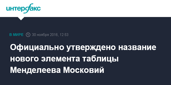 Москва. 30 ноября. INTERFAX.RU - Международный союз теоретической и прикладной химии (ИЮПАК) утвердил имена и символы для четырех элементов Нихоний (Nh), Московий (Mc), Теннессин (Ts) и Оганесон (Og) для элементов 113, 115, 117, и 118, сообщается в докладе ИЮПАК, опубликованном в среду.