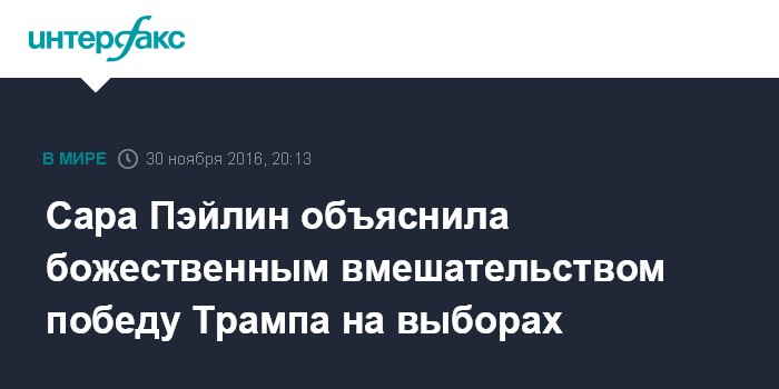 Москва. 30 ноября. INTERFAX.RU - Бывший губернатор Аляски Сара Пэйлин считает, что победа Дональда Трампа на выборах президента США частично объясняется тем, что люди молились Богу о том, чтобы американцы "очнулись".