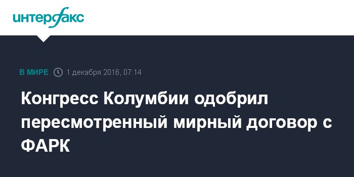 Москва. 1 декабря. INTERFAX.RU - Конгресс Колумбии ратифицировал пересмотренный мирный договор между правительством и повстанческой группировкой ФАРК. Палата представителей единогласно одобрила план, Сенат также дал свою поддержку, передает BBC.