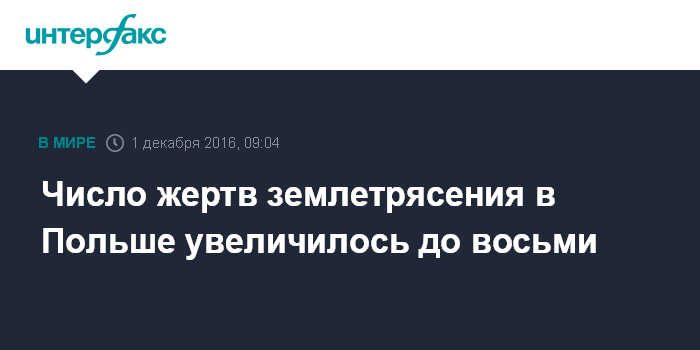 Москва. 1 декабря. INTERFAX.RU - В Польше после землетрясения в районе медной шахты "Рудна" в местности Польковице в Нижней Силезии погибли восемь шахтеров. Девять человек сумели спастись, получив легкие травмы.