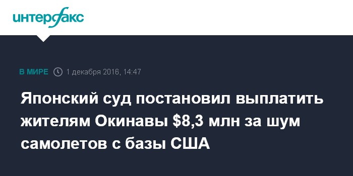 Москва. 1 декабря. INTERFAX.RU - Отделение Высокого суда Фукуоки в городе Наха (остров Окинава) постановило выплатить компенсацию в размере 950 млн йен (около $8,3 млн) 2,2 тыс. жителям города Гинован за шум самолетов на военной базе США "Футэмма", сообщают в четверг японские СМИ.