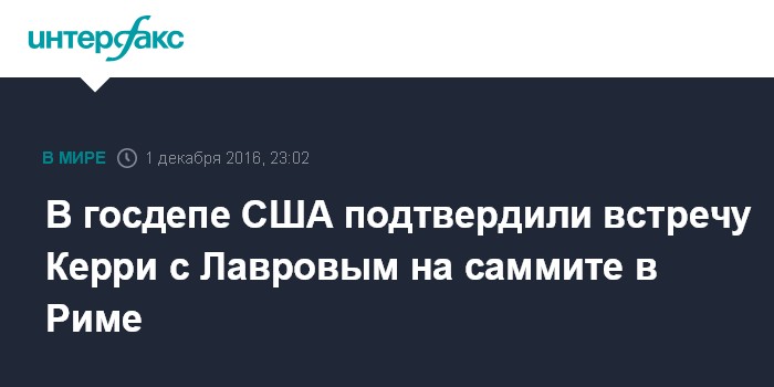 Москва. 1 декабря. INTERFAX.RU - Представитель госдепартамента США Марк Тонер в четверг заявил, что госсекретарь США Джон Керри встретится с главой МИД РФ Сергеем Лавровым в Риме в пятницу.