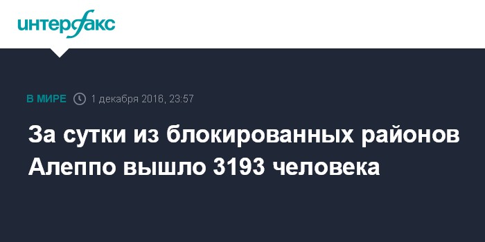 Москва. 1 декабря. INTERFAX.RU - 3193 мирных жителя покинули за сутки блокированные районы восточной части Алеппо, сообщается в четверг в информационном бюллетене российского Центра по примирению в Сирии, опубликованном на сайте Минобороны РФ.