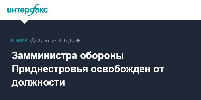 Москва. 2 декабря. INTERFAX.RU - Президент непризнанной Приднестровской Молдавской Республики Евгений Шевчук издал указ об освобождении от должности заместителя министра обороны Сергея Левшина, сообщила пресс-служба президента.