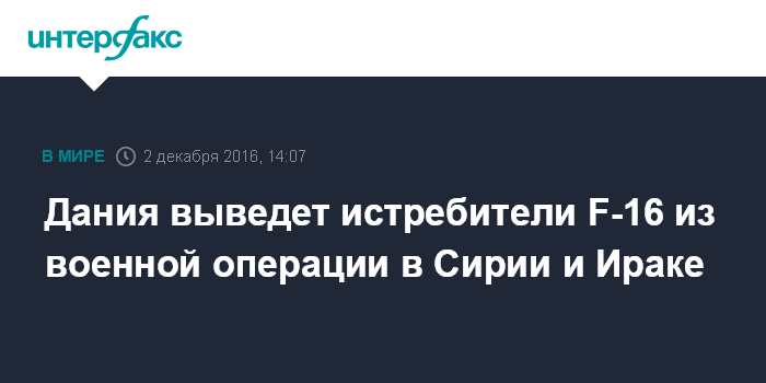 Москва. 2 декабря. INTERFAX.RU - Власти Дании намерены вывести семь своих истребителей F-16 из военной операции в Сирии и Ираке против террористов группировки "Исламское государство" (запрещена в РФ), сообщает в пятницу датский телеканал ТВ2.