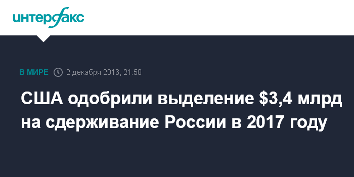 Москва. 2 декабря. INTERFAX.RU - Нижняя палата Конгресса США в пятницу приняла законопроект о выделении средств Министерству обороны в следующем финансовом году, одобрив расходы в $3,4 млрд на "сдерживание России".