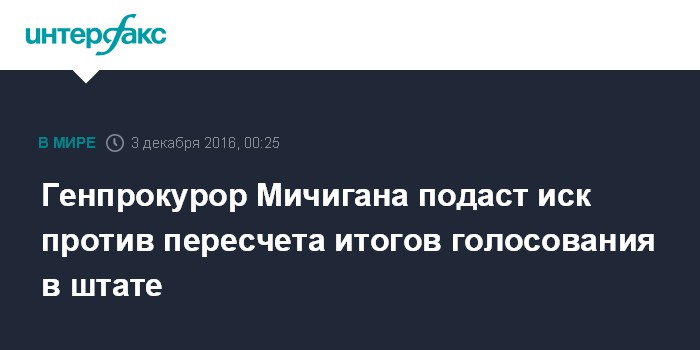 Москва. 3 декабря. INTERFAX.RU - Генеральный прокурор штата Мичиган объявил в пятницу, что готовит иск против пересчета результатов голосования на президентских выборах в США, который инициировала экс-кандидат от партии зеленых Джилл Стайн, сообщает CNN.