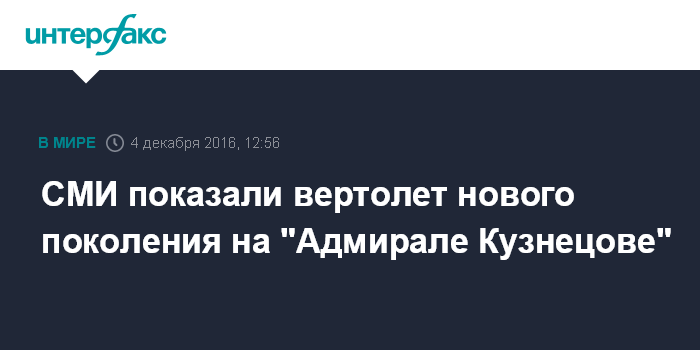 Об испытаниях "Катранов" для "Адмирала Кузнецова" "Интерфакс" сообщал в начале сентября. "Вертолеты Ка-52К уже находятся на испытаниях. Впечатления у летчиков от этой машины самые положительные", - сказал тогда агентству директор по государственным поставкам и военно-техническому сотрудничеству холдинга "Вертолеты России" Владислав Савельев.