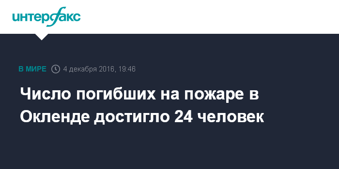 Москва. 4 декабря. INTERFAX.RU - Число жертв пожара во время вечеринки в американском городе Окленд, штат Калифорния, возросло до 24 человек. Об этом сообщает агентство Associated Press со ссылкой на местные власти.