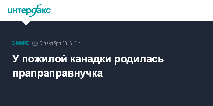 Москва. 5 декабря. INTERFAX.RU - Жительница Канады Вера Соммерфельд в возрасте 96 лет стала свидетельницей рождения собственной прапраправнучки, сообщила в понедельник BBC News.