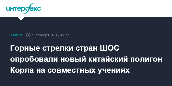 Москва. 5 декабря. INTERFAX.RU - Горнострелковые подразделения армий стран Шанхайской организации сотрудничества (ШОС) на совместном учении опробовали новый полигон Корла в 20 км от одноименного города в Синьцзян-Уйгурском автономном районе Китая, сообщил в понедельник официальный представитель Центрального военного округа (ЦВО) полковник Ярослав Рощупкин.