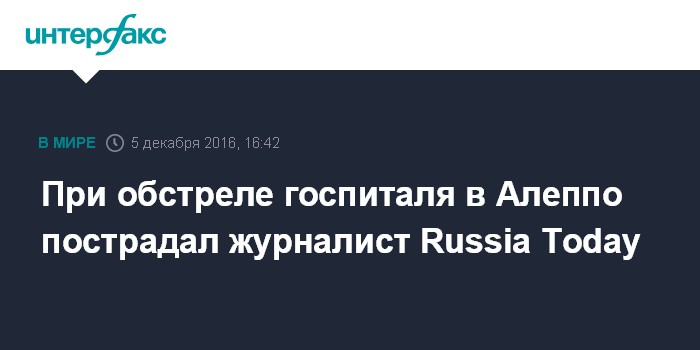 Москва. 5 декабря. INTERFAX.RU - Журналист Russia Today пострадал при обстреле госпиталя в Алеппо, об этом сообщила главный редактор телеканала Маргарита Симоньян.